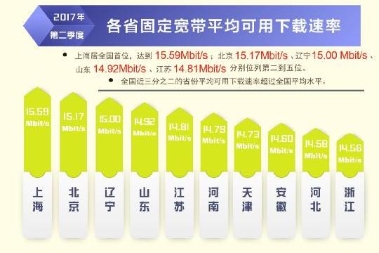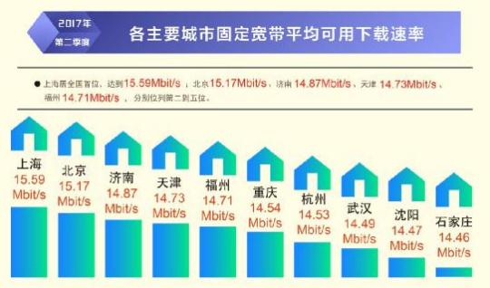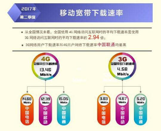 根據(jù)本次報(bào)告,除西藏自治區(qū)外,全國其他所有省級行政區(qū)域固定寬帶平均下載速率均超過 12Mbit/s,上海、北京、遼寧率先超過或達(dá)到了 15Mbit/s,位列全國前三,山東、江蘇緊隨其后。在直轄市和省會(huì)城市固定寬帶下載速率排行榜上,上海、北京、濟(jì)南、天津、福州位居前五位。從移動(dòng)寬帶網(wǎng)速狀況看,重慶、福建、遼寧、江蘇、河北的 4G 網(wǎng)絡(luò)用戶下載速率排在全國省級行政區(qū)前五位;不同電信運(yùn)營企業(yè)中,中國聯(lián)通的 3G 網(wǎng)絡(luò)用戶下載速率和 4G 網(wǎng)絡(luò)用戶下載速率均最高,分別達(dá)到 5.20 Mbit/s 和 15.05 Mbit/s。